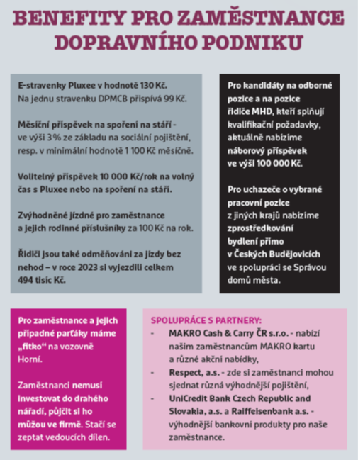 Benefitů ke mzdě nabízíme i po zásahu státního konsolidačního balíčku celou řadu, ať už těch sjednaných v kolektivní smlouvě nebo s partnery společnosti. „Zvláštní pozornost je mimo jiné věnována životním a pracovním jubileím a v neposlední řadě i kolegům, kteří se rozhodnou ukončit svou pracovní dráhu a vstoupit do zaslouženého důchodu. Těm všem ve dnech jejich pracovních či životních oslav, nebo s respektem k jejich dlouholeté a loajální práci poskytuje zaměstnavatel finanční příspěvky,“ říká Romana Tesařová. DPMCB navíc podporuje zaměstnance v dárcovství krve a kostní dřeně.