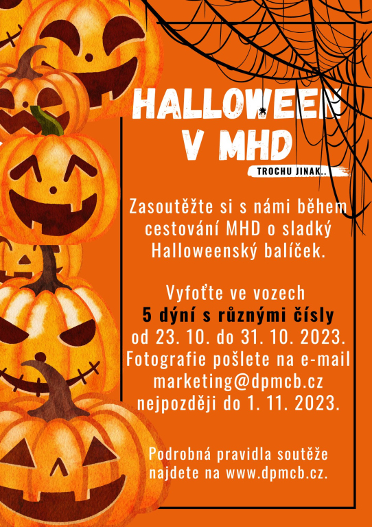 Cestující, kteří nafotí 5 obrázků dýní s různými čísly umístěných ve vozech MHD a pošlou je na e-mail marketing@dpmcb.cz do 1. 11. 2023 a budou mezi prvními 100 účastníky soutěže, se mohou těšit na sladký Halloweenský balíček. Soutěž bude probíhat v termínu od 23. do 1. 11. 2023. V každém voze MHD bude v tuto dobu umístěn jeden obrázek dýně s unikátním číslem. Po přijetí fotografií obdrží prvních 100 účastníků soutěže potvrzení pro vyzvednutí výherního balíčku. Halloweenský sladký balíček si může každý úspěšný účastník soutěže vyzvednout nejpozději do 6. 11. 2023 v předprodejní kanceláři DPMCB v DOC Mercury (Nádražní 1759, České Budějovice, samostatný vchod z ulice Žižkova tř.). Počet Halloweenských balíčků je omezený pro prvních 100 účastníků akce (rozhoduje čas doručení e-mailu organizátorovi).